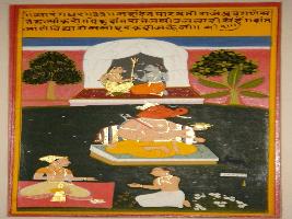 | Description / विवरण | Miniature painting based on Sarangadhar depicting Shiv in the upper part of the painting. Four armed Ganesh is seated in the centre. Sarangadhar and a king at the bottom. The Poet tells the king that Ganesh is the son of Shiv and Goddess Parvati. |