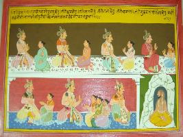 | Description / विवरण | Miniature painting based on Harivansha depicting Katman taking to his son Suketu, Dhumketu, Saptaketu, Dhisttiketu etc. in two rows while a sage is seen at the lower left corner. |