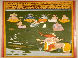 | Description / विवरण | Miniature painting based on Sarangadhar depicting Ganesh taking water in his trunk and throw on the Tridev, who are sitting with sages and a woman, depicted on the upper part of the painting. |