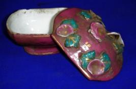 | Description / विवरण | Small ceramic box with lid. The lid has applique floral designs and painted with golden floral pattern. |