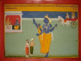 | Description / विवरण | Miniature painting based on Mahabharat - Vana parva depicting Krishna asking Yudhisthir about Vishnu, while Bali and Sukrasanya is seen in the lower part of the painting. |