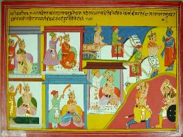 | Description / विवरण | Miniature painting based on Harivansha depicting Jarasandha, king Brihadrath is going on rath to meet Krishna. In different scenes raja Brihadrath is shown with his chauri bearer. In left below both the king are fighting with each other. |