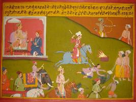 | Description / विवरण | Miniature painting based on Prithviraj Raso depicting Salakh asks king Prithviraj to go with the chaturangi army to fight with Panga without thinking anything else. |