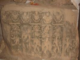 | Description / विवरण | A sculptured architectural fragment of a lintel depicting six Shiva ganas musician all are in different dancing mudra in niche. All the figures are rubbed off. All the upper portion of lintel depicting medallion. |