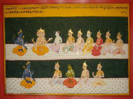 | Description / विवरण | Miniature painting based on Mahabharat - Vana parva depicting Vishnu seated with other gods viz Brahma, Varun, Soma, Sun, Yana, Kumbera etc. |