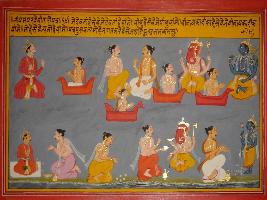 | Description / विवरण | Miniature painting based on Shri Bhagwat Gita. It depicts various priest on viman and they are depicted talking to Indra Ganesh and Vishnu. |