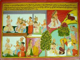 | Description / विवरण | Miniature painting based on Harivansha where Janmejaya tells the story to Vaispayan, Vishnu seated on Garuda killing Nikumbha and Shiv killing Andhakasum. |