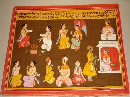 | Description / विवरण | Miniature painting based on Shri Bhagwat Gita. It depicts Brahmans doing yagna, and various man, women and Brahmans are depicted taking Indra also is depicted sitting on a couch. |