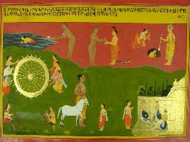 | Description / विवरण | Miniature painting based on Mahabharat - Adi parva depicting when Unak going to dispose the kundala to water he met a nude man, and with him and Takshak snaked went to Pataal where he show Indra. He also show three nagas. |