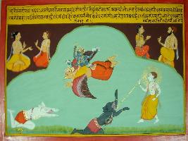 | Description / विवरण | Miniature painting based on Harivansha where Janmejaya tells the story to Vaispayan, Vishnu seated on Garuda killing Nikumbha and Shiv killing Andhakasum. |