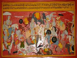 | Description / विवरण | Miniature painting based on Prithviraj Raso depicting the vigorous fight between the army of Panga and Prithviraj s commanders. |