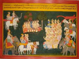 | Description / विवरण | Miniature painting based on Mahabharat - Vana parva. It depicts Krishna with other Yadavs sitting in front of Pandavas and says that the earth will drink the blood of Dushashan and other Kauravas. By saying this Krishna started snaking in anger and Arjun prays him to calm down. |