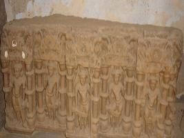 | Description / विवरण | A sculptured architectural fragment, depicting five male figures Shiv ganas , in five niches, separated by pillars. They are standing in tribhanga pose, holding different type of weapons-sword, trident etc. and drapery in the other hand. |