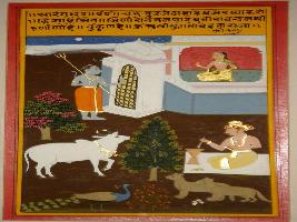 | Description / विवरण | Miniature painting based on Sarangadhar depicting Shiv standing in front of the gate of goddess Parvati s palace, below it Nandi, two tigers and a peacock are seen. |