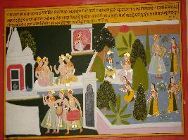 | Description / विवरण | Miniature painting based on Sanskrit drama Malti Madhav depicting at the left side Mandarika talking to Kalhans. After that she saw Makarand and Madhav then Makarand ask her about Malti. Then she replied that she is looking at them from the palatial balcony. On the upper right four natas are seen sitting on a cushion in front of a Shiv temple, below whom three well-dressed musicians are seen with a screen to perform the play. |