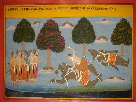 | Description / विवरण | Miniature painting based on Mahabharat - Vana parva depicting Bhim is killing a demon and after that went to Deva vana with other Pandavas and Draupadi. |