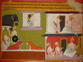 | Description / विवरण | Miniature painting based on Prithviraj Raso depicting Prithviraj coming with all Samants and planning for battle with king Panga. |