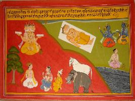 | Description / विवरण | Miniature painting based on Shri Bhagwat Gita. It depicts Brahma s day and nights are of many thousand years. He is born of Sarvadeva. He comes back from jungle and meet Krishna. |