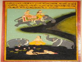 | Description / विवरण | Miniature painting based on Sarangadhar depicting the usefulness of elephant. Elephant can be used in throwing water for bath and cross the river. At the lower panel, king is depicted taking a bath and elephants are shown plucking lotus and throwing water on the king. |