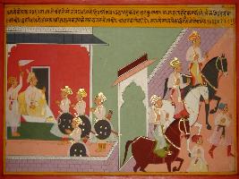 | Description / विवरण | Miniature painting based on Prithviraj Raso depicting Court of Jaichand. He called Samant Pradhan and Purohit Kanth and ask them to meet Kavi Chandvardai with various kind of scouted food items and other gifts. Both of them get ready and move on horseback. |