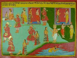 | Description / विवरण | Miniature painting based on Mahabharat - Adi parva depicting a demon taking away the wife of Brihgu sage. Brahma is depicted consoling his wife who has a son. It also depict sage Brihgu cursed Agni. |