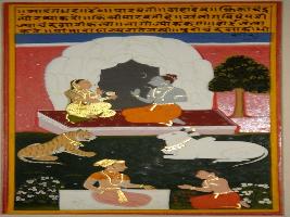 | Description / विवरण | Miniature painting based on Sarangadhar depicting Shiv and Goddess Parvati in the upper part of the painting, their vahan- tiger and Nandi are sitting near them. |