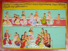 | Description / विवरण | Miniature painting based on Harivansha depicting Kashayap talking with his sons, Sanjay, Furanjay, Trianjay, Mahasal, Mahamana separately in a row. While his five sons and their queens are seen in the lower row. |