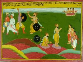 | Description / विवरण | Miniature painting based on Mahabharat - Adi parva. It depicts at upper left Parshuram fighting with Kshatriyas. When kshatriyas died river water turned to blood. |