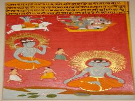 | Description / विवरण | Miniature painting based on Shiv destroying Tripura. The Tripura fort was constructed by a Rakshasa named Tatar. Five headed Shiv, with a halo behind the head, is seen meditating in the lower part of the painting. |
