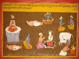 | Description / विवरण | Miniature painting based on Shri Bhagwat Gita. It depicts Krishna preaching Arjun about his existence in all things of the creation. And anybody can get his influence by doing Dhyana . On the painting depicts Vishnu, a sage Shiv, Durga on basis of above mentioned them. |