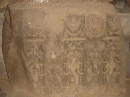 | Description / विवरण | A sculptured architectural fragment probably a part of a wall depicting two Shiva ganas in dancing position. The figures of other three Shiva ganas depicted in the niche is chopped off. Above the ganas half lotus medallion is seen, one of which is only in its intact form and other two are chopped off while one is slightly broken. |