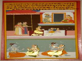 | Description / विवरण | Miniature painting based on Sarangadhar depicting Parvati worshipping Mahadev along with other deities, in the lower part Shiv and Parvati are having a conversation and then in loving union. |