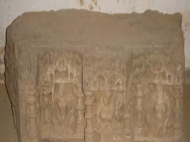 | Description / विवरण | A sculptured architectural fragment depicting three Shiv ganas in niche, separated by pillars towards extreme right a male seated, figure holding a sword and a shield. Next to him are two seated female figure holding something which are worn out. The figure are rubbed out. |