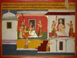 | Description / विवरण | Miniature painting based on Prithviraj Raso depicting Junhai , queen of Jaichand, called her friend for discussion about Kavi Chandvardai. The friend went to king Jaichand and told his about the event. |