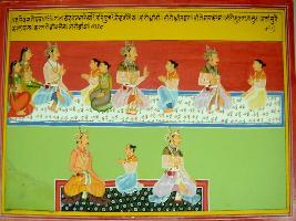 | Description / विवरण | Miniature painting based on Harivansha depicting Raja Brahdamna seated with his two queens and then talking to his five sons separately. |