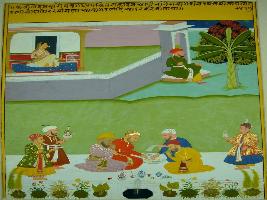| Description / विवरण | Miniature painting based on Kalila Damana - two jackals depicting a group of merchant eating and drinking and on upper part a lady is depicted inside the palace. Painting has Mughal influence. |