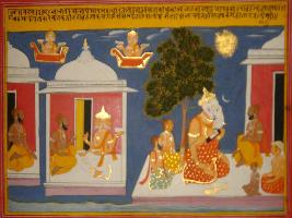 | Description / विवरण | Miniature painting based on Mahabharat - Adi parva depicting Brahma giving knowledge to a saint. |