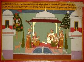| Description / विवरण | Miniature painting based on Prithviraj Raso depicting queen Junhai of Jaichand sitting with her friends. |