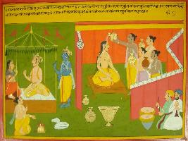 | Description / विवरण | Miniature painting based on Mahabharat - Rajdharma parva. the painting depicts the coronation ceremacy of Yudhisthir where Krishnaji also seen and priests are offering holy water and musicians are playing drama. |