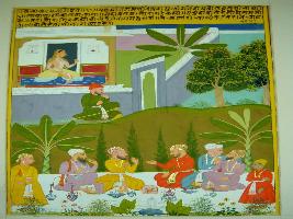 | Description / विवरण | Miniature painting based on Kalila Damana. On the lower part some peoples are depicted feasting and on the upper part queen is depicted with her slave. Queen is depicted sitting in the palace. Mughal influence can be seen. |