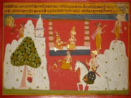 | Description / विवरण | Miniature painting based on Prithviraj Raso depicting appearance of a female from rays of sun. She came out to be daughter of a king and took birth after several years of penance and she is Junhai. |