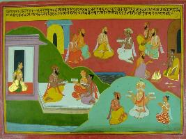 | Description / विवरण | Miniature painting based on Mahabharat - Adi parva. Left side Satyavati is looking for someone. To right Kashayap sage is talking with God. And to right Kashayap sage is praying to Brahma, and right down a sage is doing yoga. |