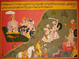 | Description / विवरण | Miniature painting based on Prithviraj Raso depicting Prithviraj talking to his ministers and telling about his hunting incident at upper right level. |