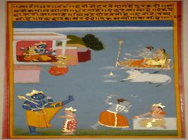 | Description / विवरण | Miniature painting based on Sarangadhar depicting Vishnu with Lakshmi and Garuda. Shiv Parvati and Nandi are sitting in the left side. In the lower part a king is standing below the feet of Vishnu, while Shiv in the Rudra form is attaching another king. |