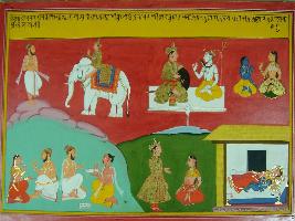 | Description / विवरण | Miniature painting based on Mahabharat - Adi parva depicting birth of Arjun, Pandu asked Kunti to call for Indra. Indra came to Kunti and gave her son named Arjun. Mahadev told Indra that Arjun would be greatest archer in the contemporary world. Kunti is shown with Arjun at lower and upper left part. |