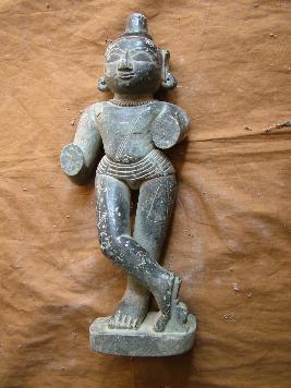 | Description / विवरण | This crude image of krishna is installed on a flat rectangular shaped pedestal in standing pose, but her right leg is shown bended. It s both hands are broken. A garland in his neck, a bump on his head can be seen. |