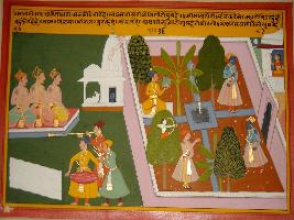 | Description / विवरण | Miniature painting based on Sanskrit drama Malti Madhav depicting Madhav thinking of Malti who is beautiful like Chandrama and left his all shame, patience and politeness in love of Malti. |