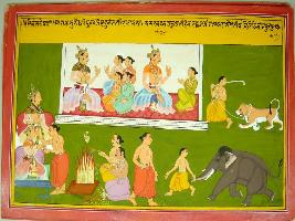 | Description / विवरण | Miniature painting based on Harivansha depicting Raja Surodh sitting with four sons, his eldest son Dushyant shown with his son Bharat, at top right part. At the top left part, Bharat is shown playing with a tiger. He is shown holding elephant trunk at lower left. To its right, a yagna is being performed and over a flame a drinking vessel is shown. At the top right, Bharat s son Vithiviti is shown ascending the throne. |