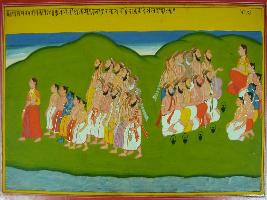 | Description / विवरण | Miniature painting based on Mahabharat - Adi parva depicting sages going to Kunti and asking her to go to Hastinapur with them. Kunti is shown taking her sons and leaving for Hastinapur with sages. |