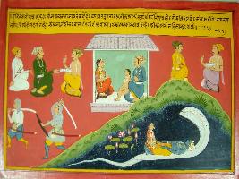 | Description / विवरण | Miniature painting based on Harivansha depicting Sheshshyayi Vishnu with Lakshmi at the lower left side. Above them Vaispayan is describing a story to a king. At the centre the king with his wife and daughter are depicted. Right to them also a king is depicted talking to two men. Below them, two men are seen going for war. |